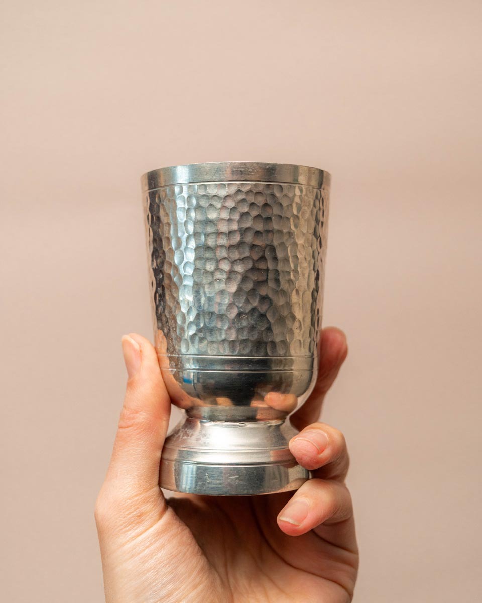 Deze set van zes bekers is echt een stoere toevoeging aan je servieskast. Ze zijn gemaakt van zilverkleurig tin en hebben een prachtig gehamerde structuur, wat zorgt voor een mooie glans en een fijne grip. Onderop vind je het merkstempel Pura, een teken van degelijke kwaliteit. Ik vind deze bekers vooral heel fijn omdat ze drankjes heerlijk koel houden, maar ze staan ook gewoon ontzettend decoratief op een open plank. Of je ze nu gebruikt voor een koud drankje of als unieke vaasjes voor kleine veldbloemen; ze brengen direct een tikkeltje karakter op tafel.