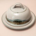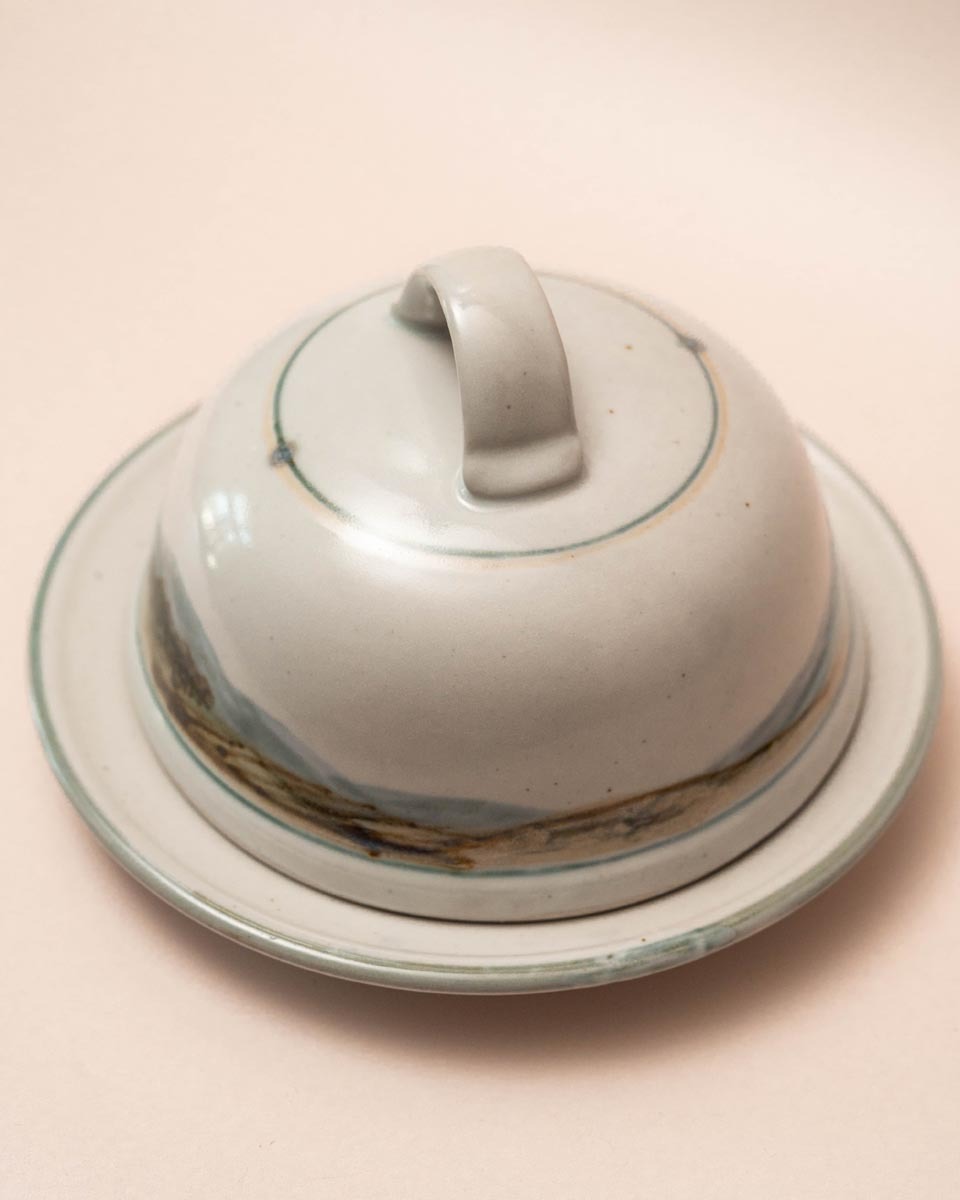 Deze botervloot is handgemaakt door Highland Stoneware in Lochinver, Schotland, en dat vakmanschap zie je in alles terug. Het landschapspatroon is met de hand op het aardewerk geschilderd, waardoor je de Schotse heuvels bijna voor je ziet. Ik vind het een heerlijk stevig item dat zowel praktisch als decoratief is. De oude stempel aan de onderzijde laat zien dat dit een ouder exemplaar is, wat hem net dat beetje extra karakter geeft voor op een gezellig gedekte tafel.