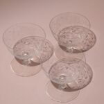Set van drie lage glazen op een voet, versierd met een sierlijk, gegraveerd bloemmotief.