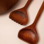 Grote schaal en bestek set van teakhout. Ideaal voor het serveren van salades. Handgemaakt in Thailand.
