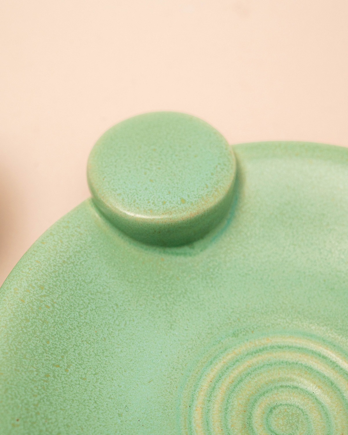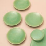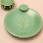 Het grotere schaaltje heeft een prachtig swirl-reliëf dat vanuit het midden naar buiten waaiert, afgewerkt met een elegant rond handgreepje. Bij dit schaaltje horen vier schattige mini-exemplaren van 6 cm in precies dezelfde frisse mintgroene tint. Ik zie deze set al helemaal voor me tijdens een gezellige high tea of een borrel: het grote schaaltje voor de koekjes of toastjes, en de kleintjes voor verschillende smaken jam, bonbons of dips. De kleur is waanzinnig vrolijk en het reliëf geeft de set een luxe, bijna glazen uitstraling.
