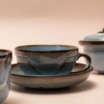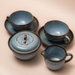 Dit koffiesetje is een echte Nederlandse designklassieker. Het servies, genaamd Zuiderzee, werd ontworpen door Cor van Tricht en is uitgevoerd in een prachtige lichtblauwe kleur met die kenmerkende bruine accenten langs de randen. De set bestaat uit twee kop en schotels, een suikerpotje en een melkkannetje. Wat ik zo fijn vind aan dit servies, is de combinatie van de strakke vormgeving en de warme, bijna natuurlijke uitstraling van het glazuur. Het is een heerlijk setje om de dag mee te beginnen of om gezellig samen een kopje koffie uit te drinken.
