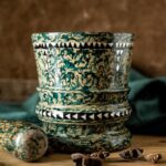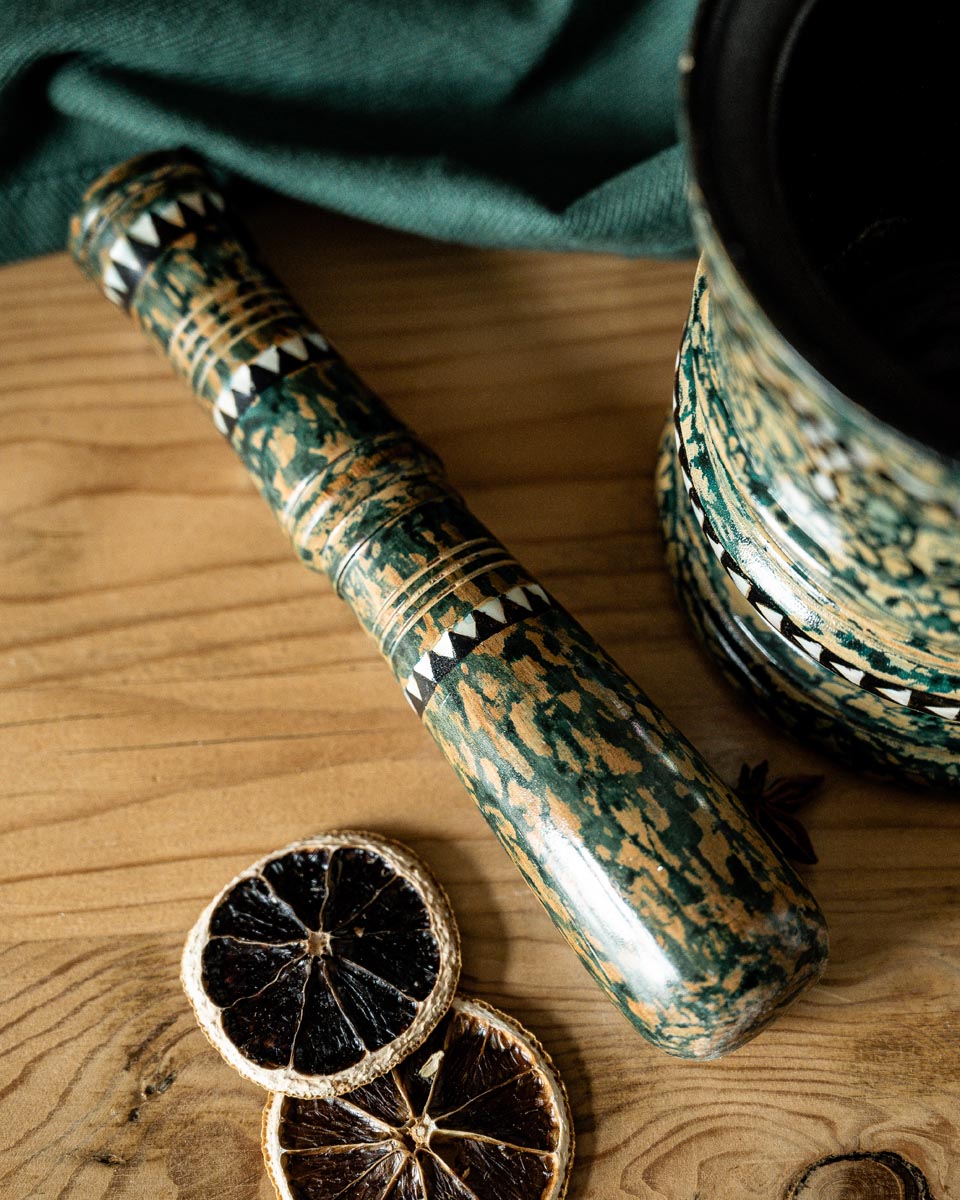 Unieke groene vijzel en stamper met zwarte en ivoren pearl details. Zowel de vijzel als de stamper zijn van hout gemaakt.