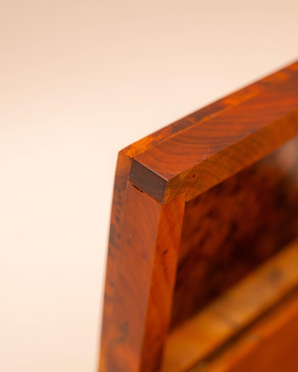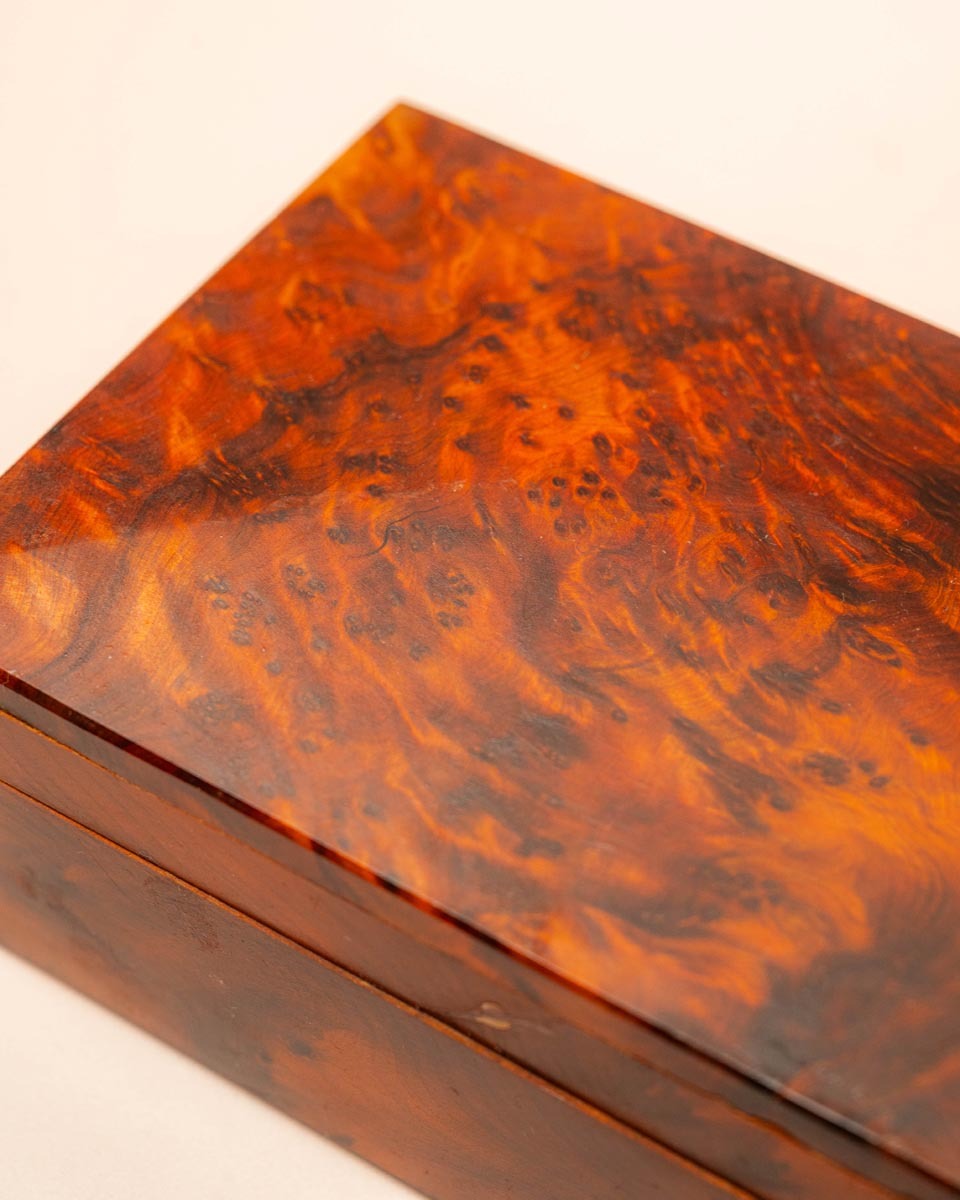 Thuya is een conifeer die alleen in Noord-Afrika groeit. Vooral de wortels van de boom worden gebruikt voor dit soort verfijnde kistjes, omdat daar de tekening het meest complex en grillig is. Het hout bevat natuurlijke oliën die een harsachtige, ceder-achtige geur verspreiden die jarenlang aanhoudt.