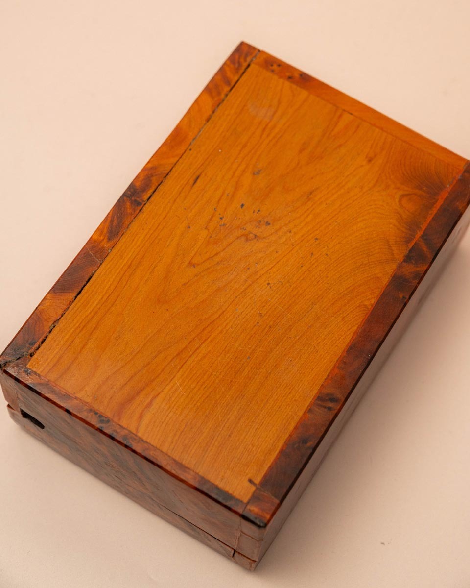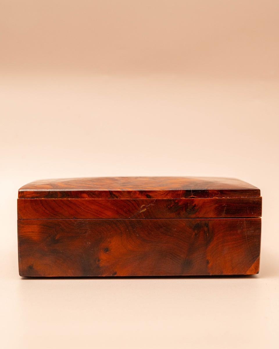 Exotisch handgemaakt kistje van geurig Thuya-hout. Bekend om zijn schitterende tekening en aromatische geur. Een authentiek object met een kleine imperfectie rechtsachter.