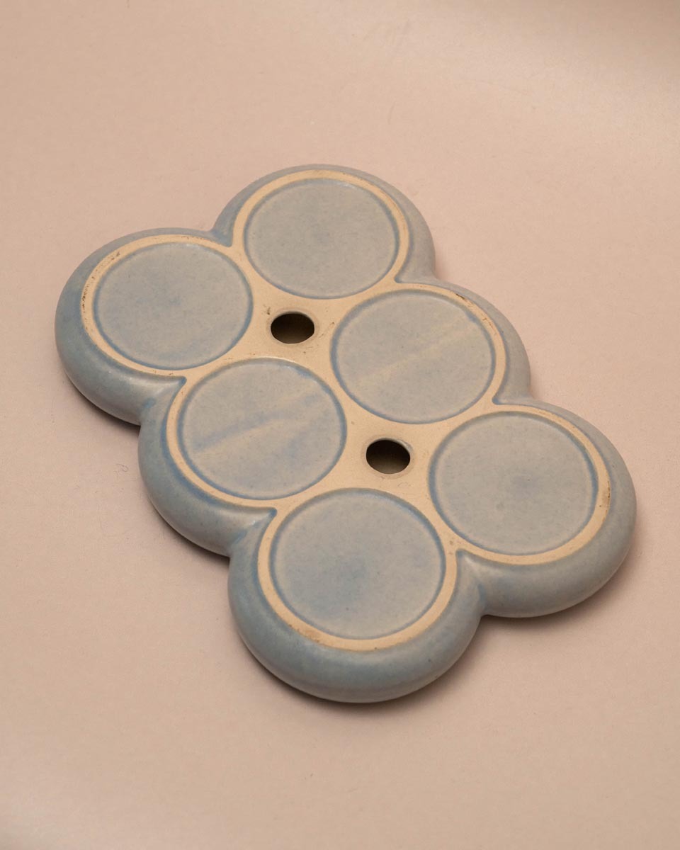 Dit type schaal lijkt op een eierhouder maar wordt ook wel een escargotschaal genoemd, oorspronkelijk dus bedoeld voor het serveren van slakken. Wat ik er zo leuk aan vind, is dat je er alle kanten mee op kunt. Gebruik hem op de ontbijttafel als eierhouder, serveer er kleine hapjes in of gebruik hem op je bureau voor paperclips en ringen. Het ontwerp is minimalistisch en door de organische vormen past het goed binnen een modern of mid century interieur. De lichtblauwe kleur is typisch voor servies uit de jaren zeventig en tachtig, toen pastelkleuren in de keuken erg in trek waren.