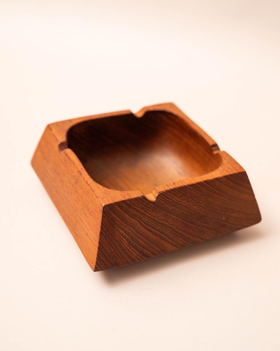 Vierkante asbak van zwaar teakhout. Mooie donkerbruine kleur. Kan ook gebruikt worden als bewaarschaaltje.