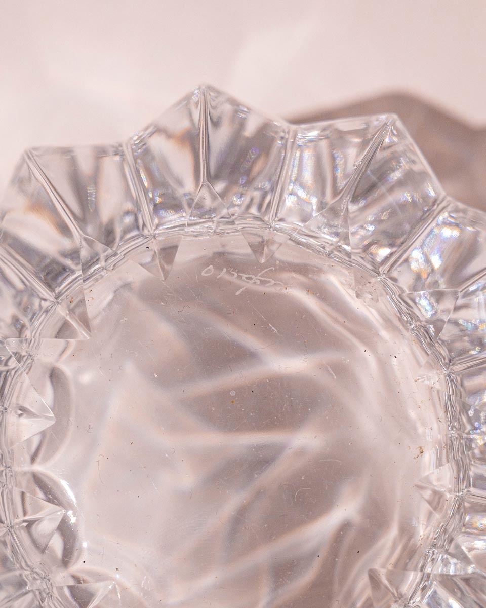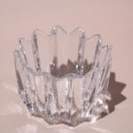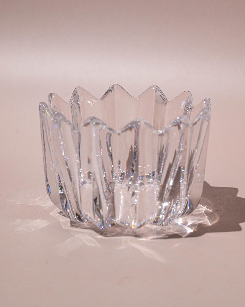 Dit is een prachtig stukje Zweeds design, de ‘Fleur’ schaal van Jan Johansson voor Orrefors. De schaal is gemaakt van zwaar kristalglas en heeft een supermooi, helder patroon dat door de uitstekende rand doet denken aan bloemblaadjes of een bloeiende bloem, vandaar de naam ‘Fleur’. Het kristal vangt het licht op een fantastische manier. Hij is perfect voor een waxine lichtje, en staat ook schitterend als decoratief object op een tafel of dressoir. Echt een tijdloos pronkstuk.