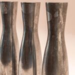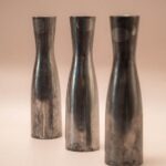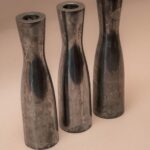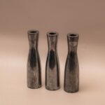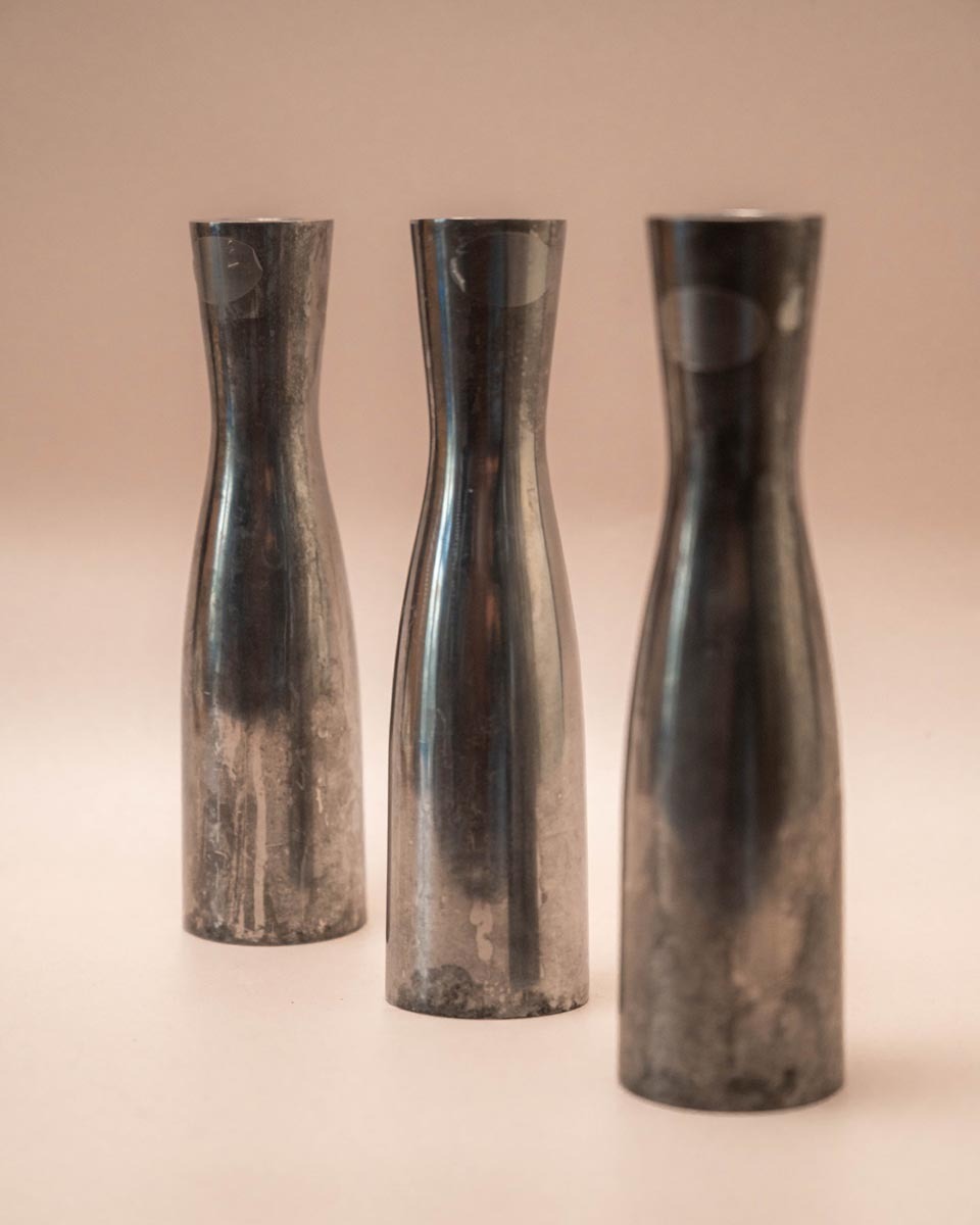 Drie zilverkleurige metalen kandelaren in verschillende hoogtes, ontworpen door de Zweedse Erika Pekkari. Een tijdloze set van zware kwaliteit met een minimalistische uitstraling.