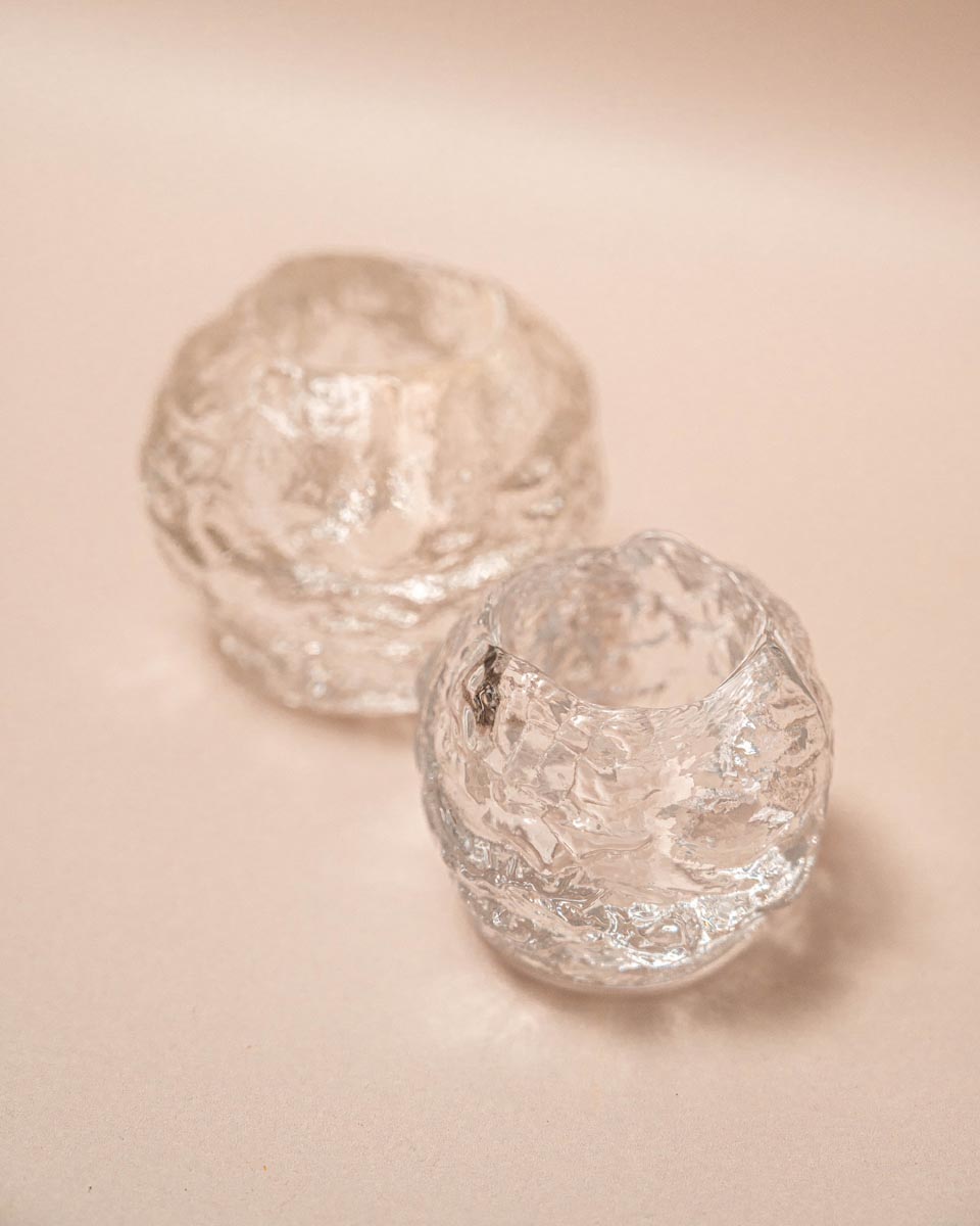 Twee prachtige glazen sneeuwballen van het Zweedse Kosta Boda. Deze zware waxinelichthouders zorgen voor een magische lichtinval en zijn een klassieker onder de Scandinavische woonaccessoires.