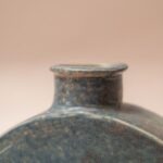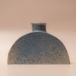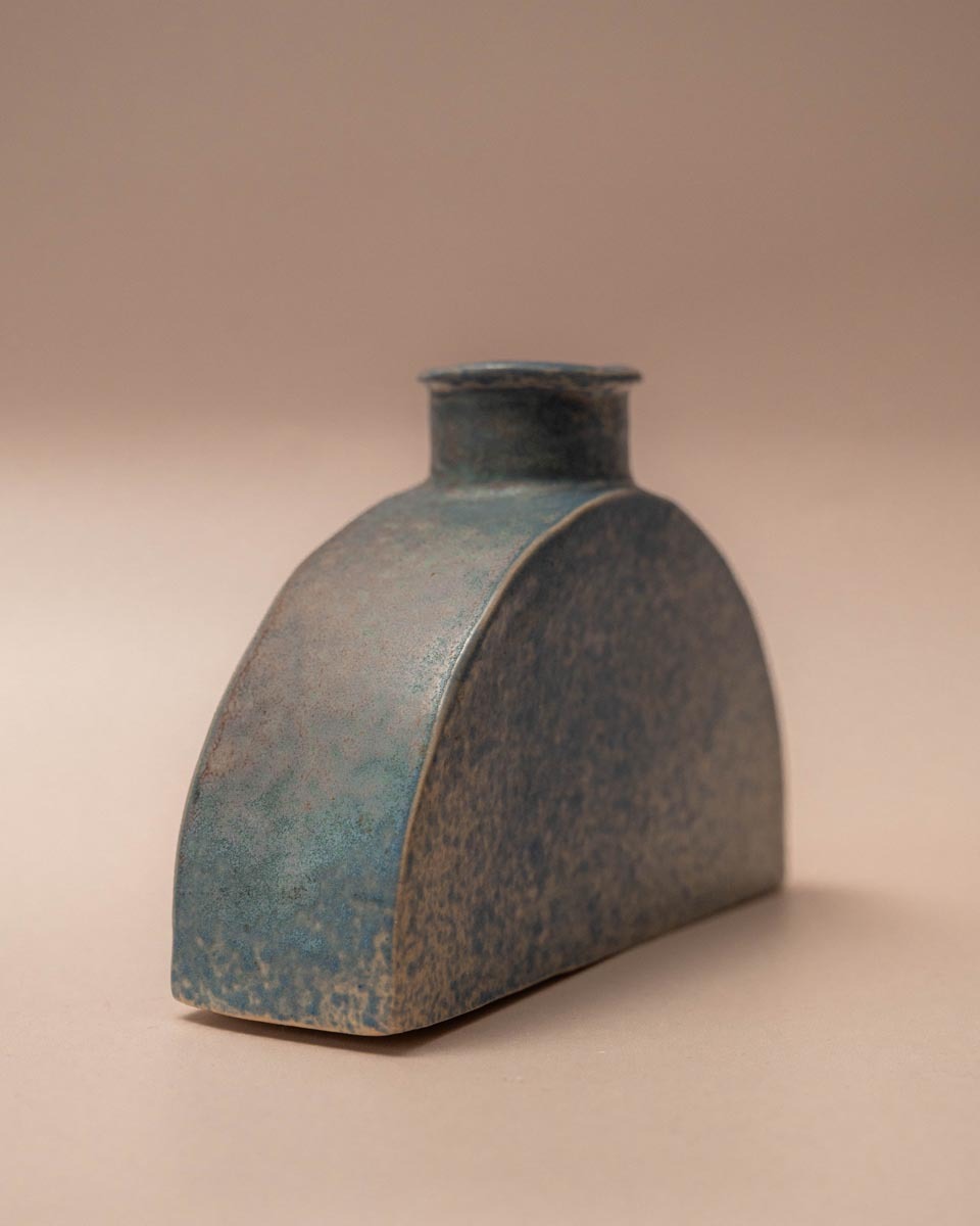 Deze vaas valt vooral op door zijn bijzondere, geometrische vorm. De vaas heeft de vorm van een halve cirkel met een smalle hals, wat hem een heel moderne en architectonische uitstraling geeft. Hij is uitgevoerd in een rustige lichtblauwe kleur die perfect past bij de strakke lijnen van het ontwerp. Ik vind hem prachtig met één enkele tak of een droogbloem erin, maar ook zonder bloemen is het een object dat direct de aandacht trekt. Aan de onderzijde is hij persoonlijk gesigneerd door de maker, Ingrid.