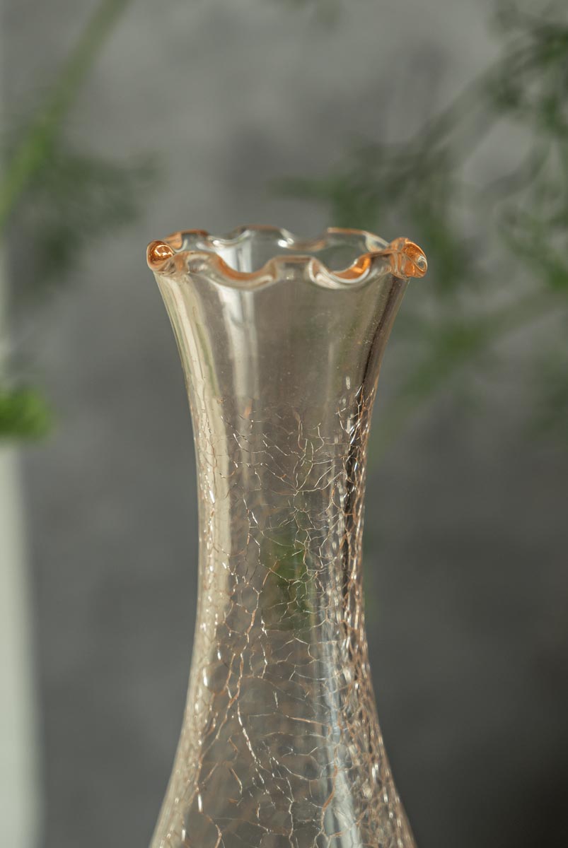 Sierlijke vintage vaas van roze crackle glass met een golvende rand.