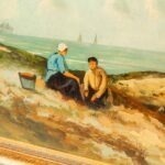 Dit sfeervolle schilderij vangt een van de meest iconische plekken van de Nederlandse kust: de Vuurbaak van Katwijk. Op de voorgrond ziet u een prachtig uitgestrekt duinlandschap dat de kijker meeneemt naar de achtergrond, waar de zee glinstert onder een helderblauwe lucht met karakteristieke witte wolken. Het werk is rechtsonder gesigneerd met de initialen ‘MS’. Het schilderij is gevat in een zware, klassieke lijst die de panoramische compositie extra kracht bijzet.